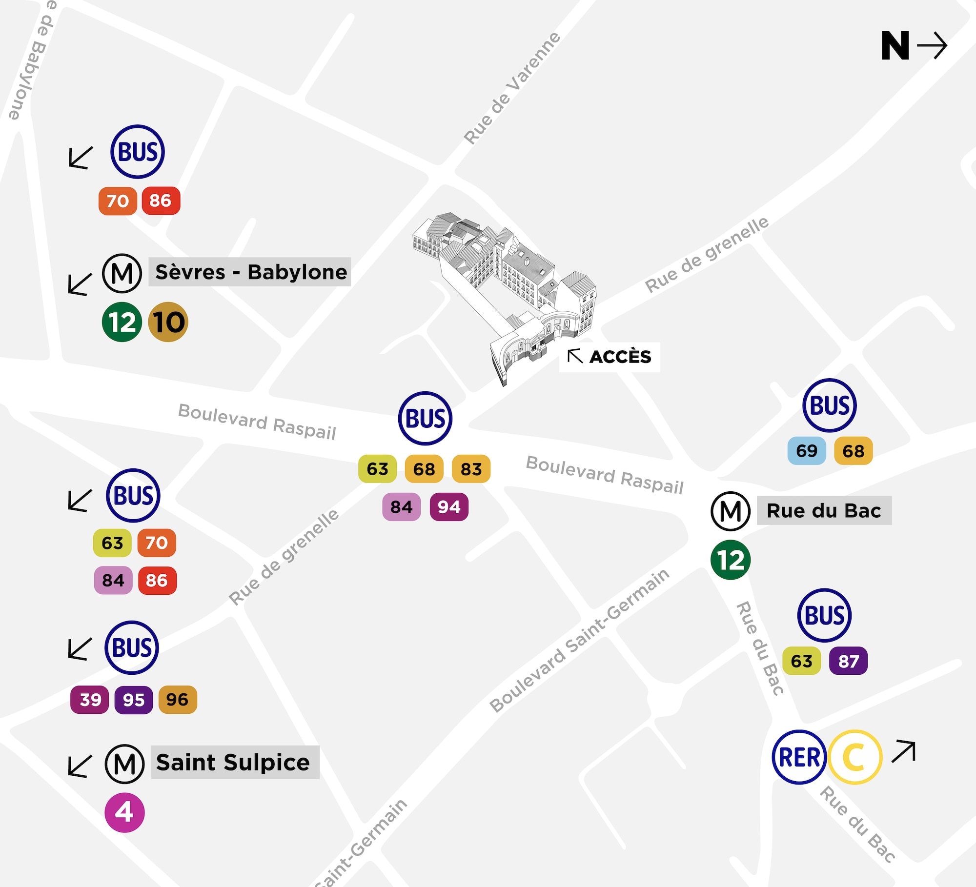 Métro : Lignes 12 (Rue du bac ou Sèvres-Babylone), ligne 4 (Saint-Sulpice), et Ligne 10 (Sèvres-Babylone).